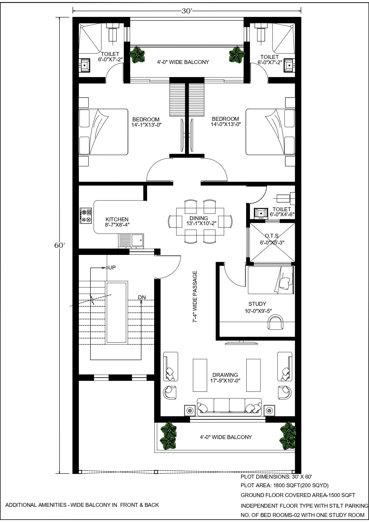 Explore HomePlanr's custom 2-bedroom plus study home plan, featuring stilt parking on a 30'x60' plot. This 1800 sqft (200 Sq Yard) layout provides a generous 1500 sqft ground floor, meticulously designed for individual floor living with an added touch of academic elegance.