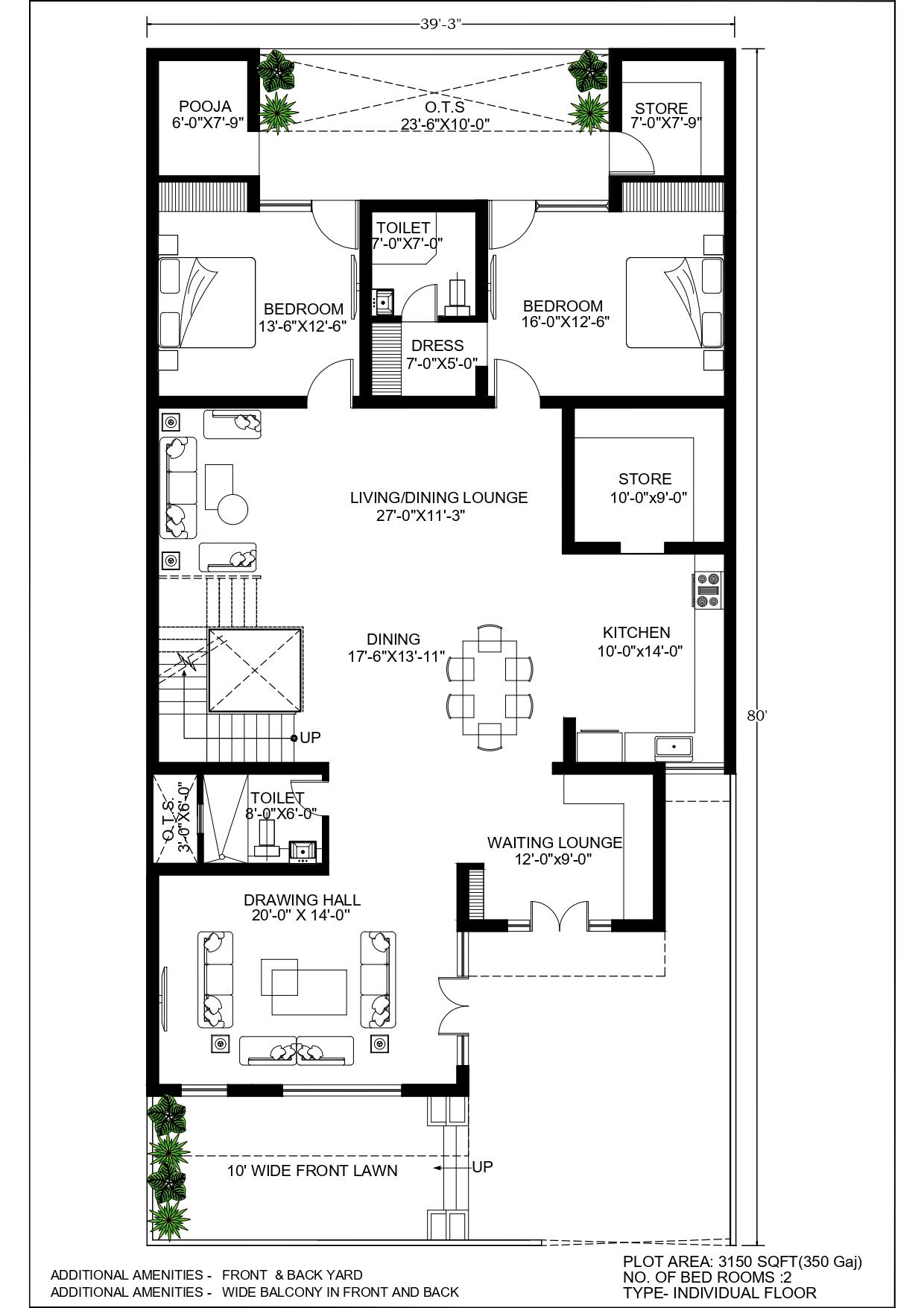 Prototype 17 | 2-Bedroom Home | Individual Floor Plan | 39'3"x80' Independent Floor type | 3150 Sq Ft (350 Gaj) Layout