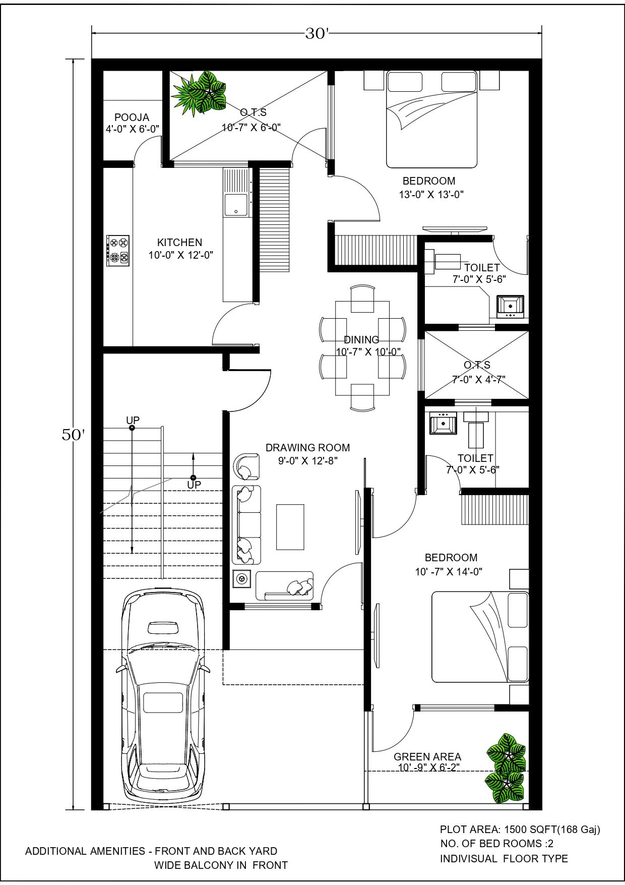 Prototype 2 | 2 Bedroom Home | Individual Floor Plan | 30'x50' | 1500 Sqft (168 Gaj) Layout